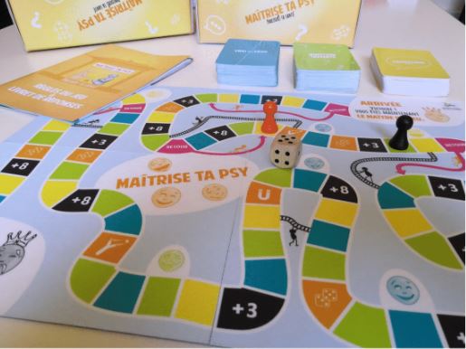 « Psycha’Quiz » est un jeu collaboratif dont le but est de battre le plateau, représenté par le pion «maître du jeu ». Les joueurs doivent répondre ensemble à des questions en lien avec leur maladie, leurs droits en tant que patient, en tant que citoyen et leur parcours santé. Un livret de réponse a été créé afin que les participants puissent jouer et partager leurs connaissances sans que la présence d’un soignant ne soit obligatoire. C’est un outil de savoir commun qui favorise le partage entre patients, soignant et aidants. Le jeu a été pensé pour favoriser l’échange, le débat constructif et le lien entre ces trois protagonistes du rétablissement. L’acquisition des connaissances liée à une pathologie induit mieux connaitre et savoir repérer les situations à risques ainsi que les signes de rechutes.