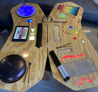La « table musicale » est une activité thérapeutique pour les adolescents psychotique qui souffrent de troubles de la perception sensorielle et d’une désorganisation de la pensée. Elle se compose de plusieurs instruments de percussions, d’une tablette numérique, d’une enceinte Bluetooth et d’effets lumineux, tous les éléments étant incorporés sur un même support autour duquel chacun se place. Cette médiation vise à favoriser la communication chez l’adolescent qui éprouve une difficulté voire une impossibilité à entrer en relation, tant le monde extérieur lui apparaît une barrière parfois infranchissable et dangereuse, irréelle et impalpable.